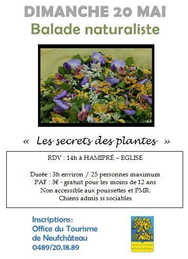 Balade naturaliste ce dimanche, à 14h à Hamipré, avec Bernadette Delit comme guide. Thématique :" Les secrets des plantes". Réservation : 0489/20.18.89
